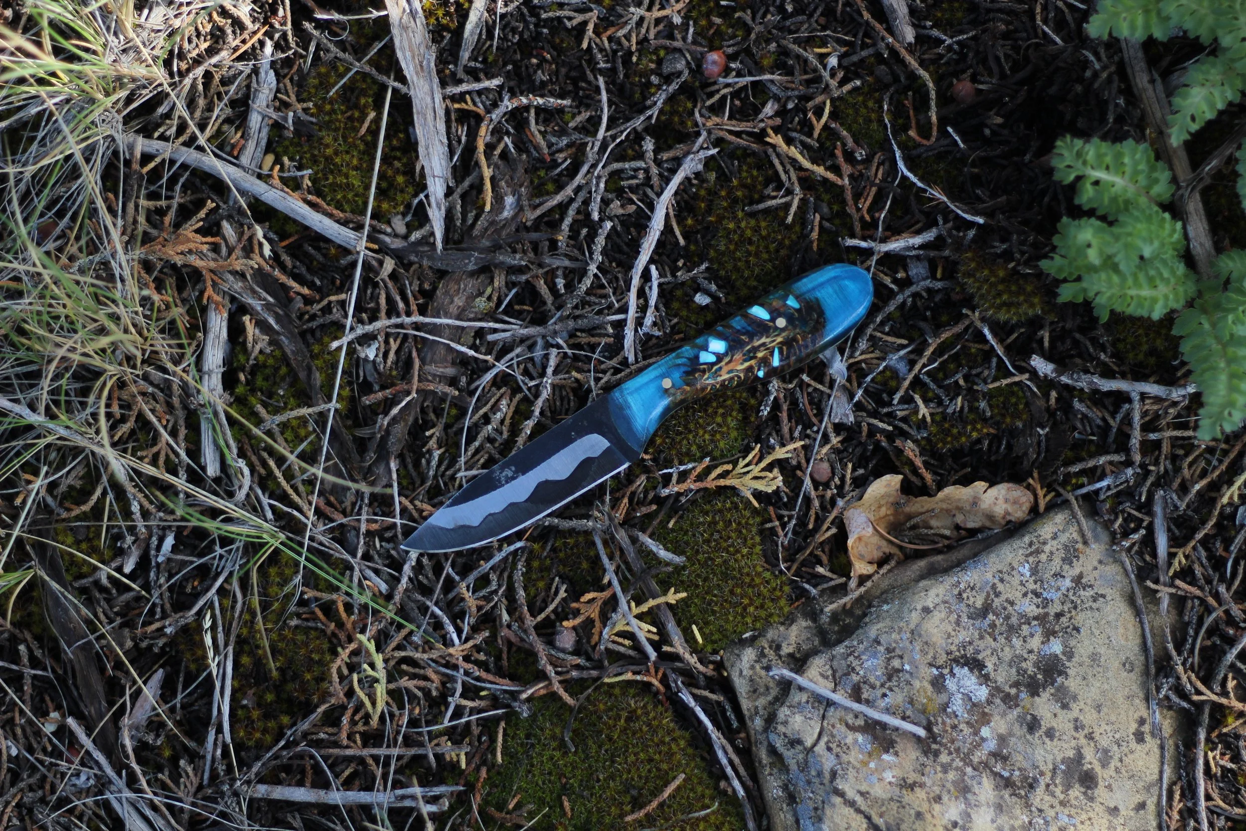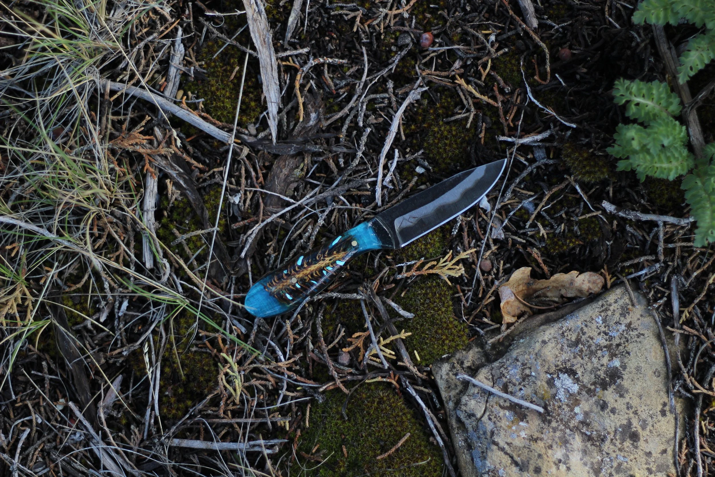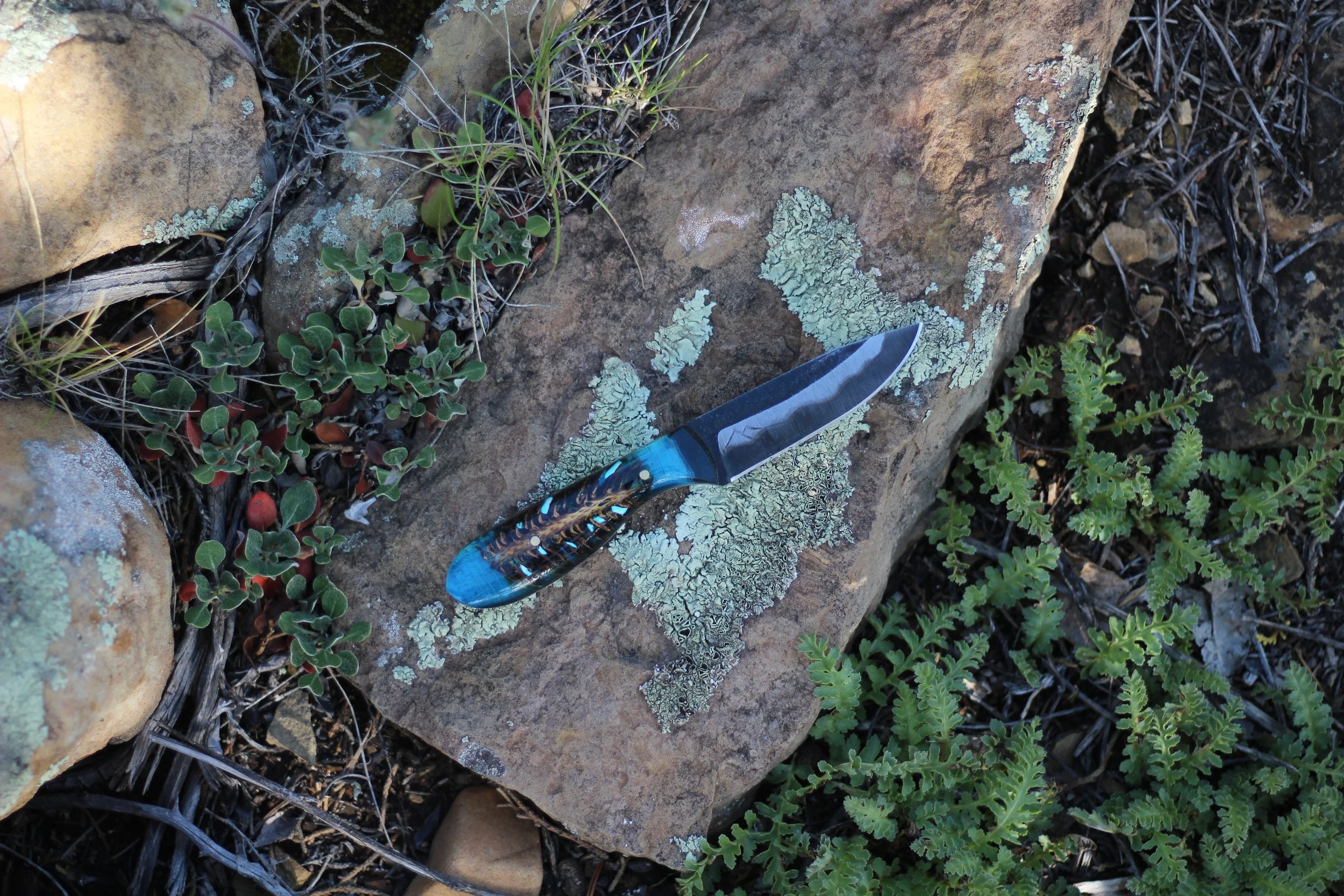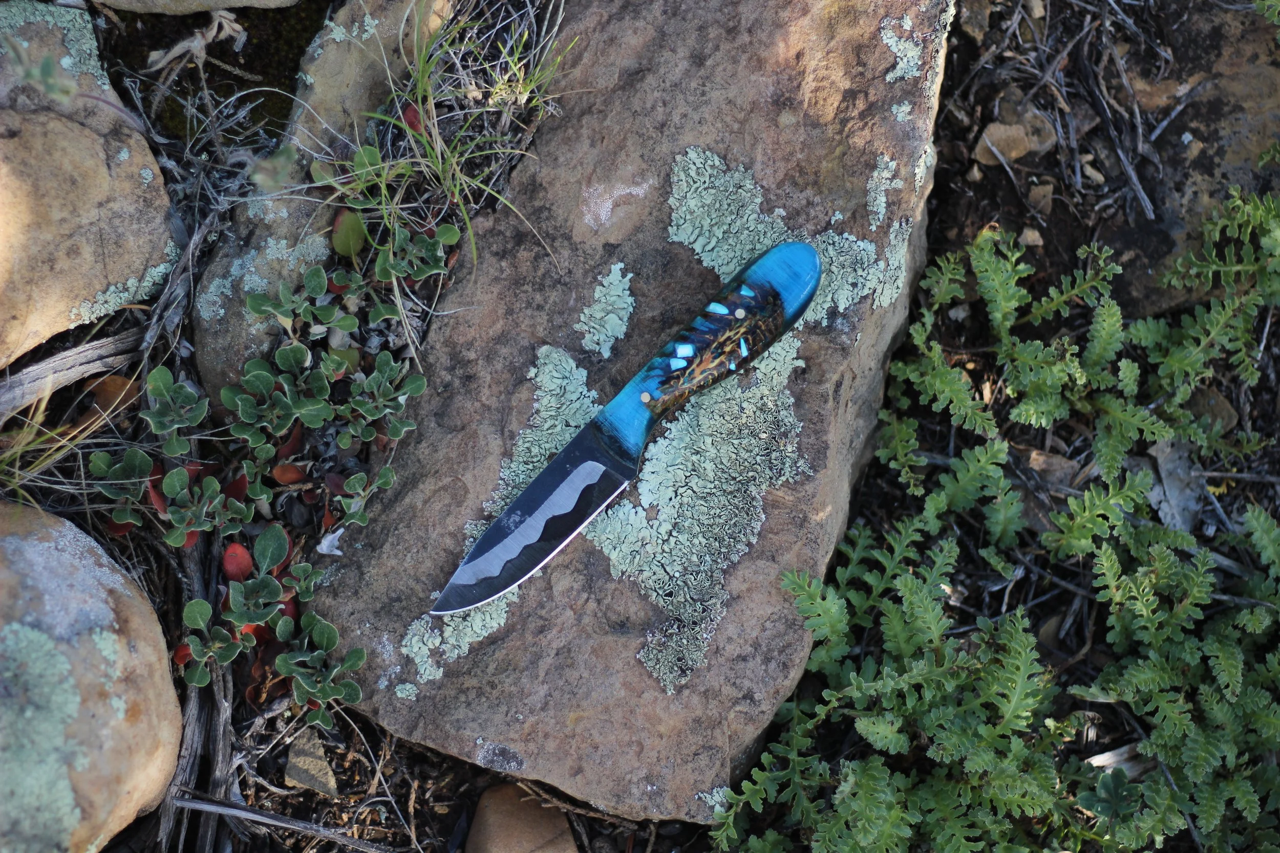 This knife is a great edc. The total length of the knife is 7 inches. The blade is made out of 52100 high carbon steel. The handle is an epoxy resin pinecone with turquoise stones.