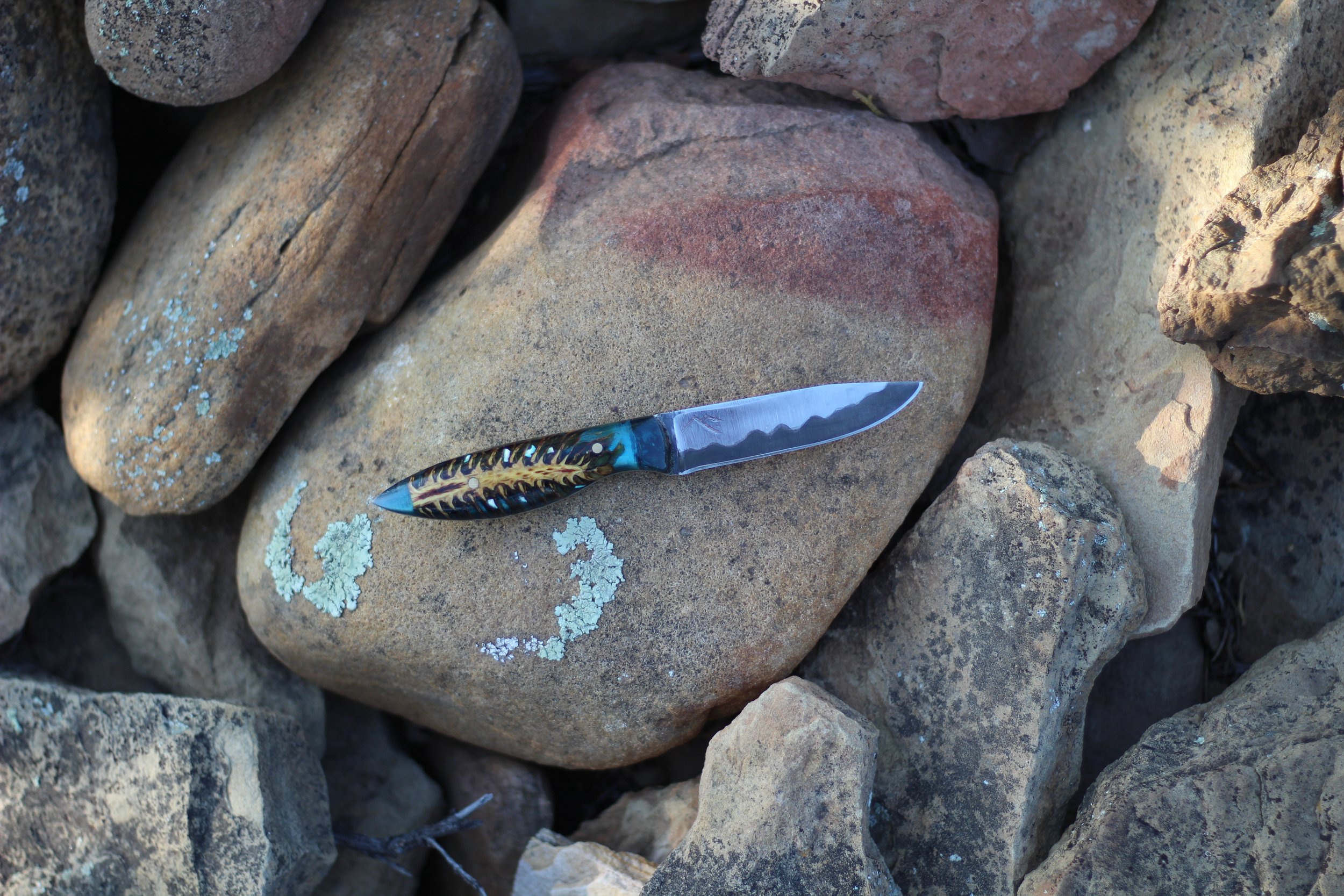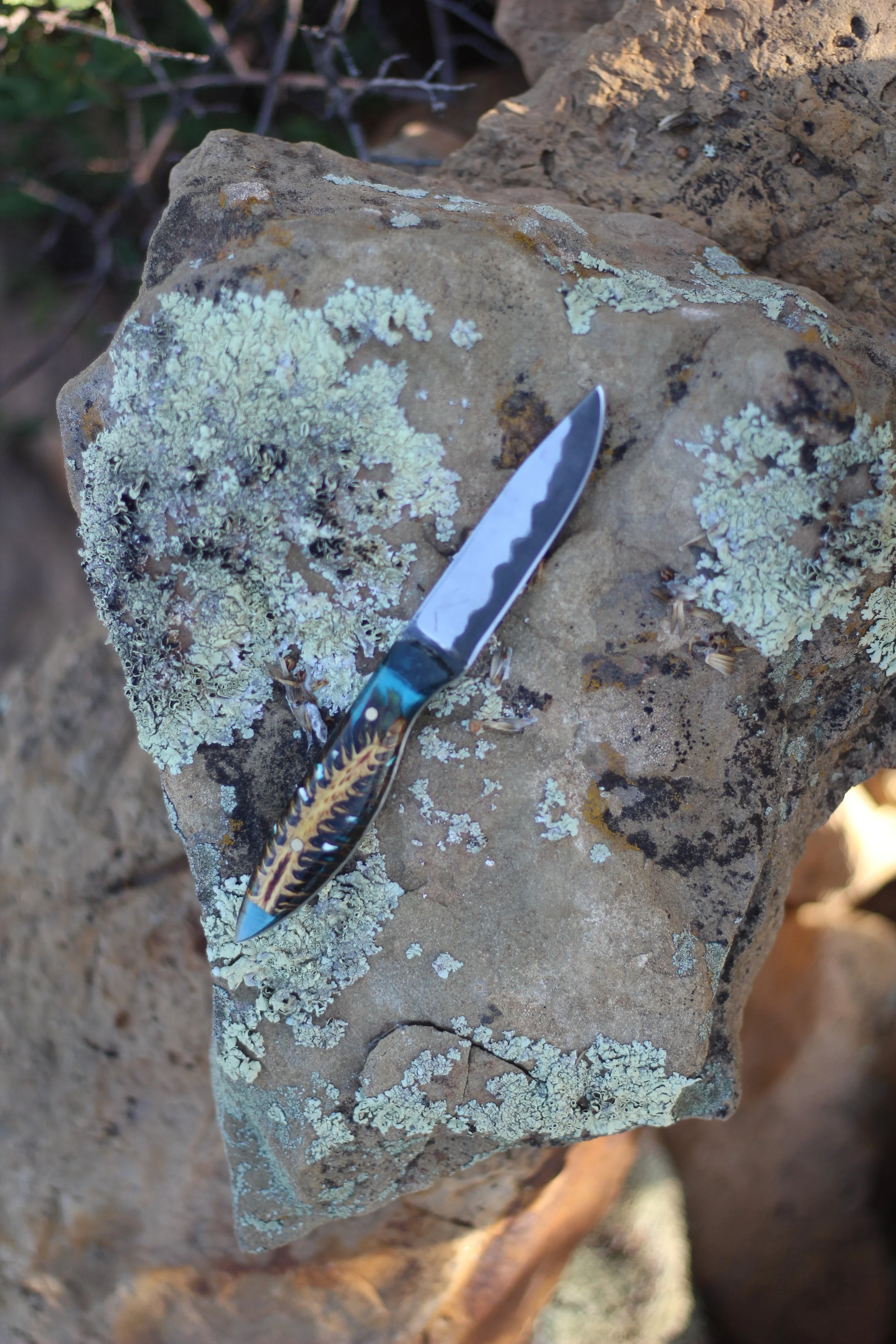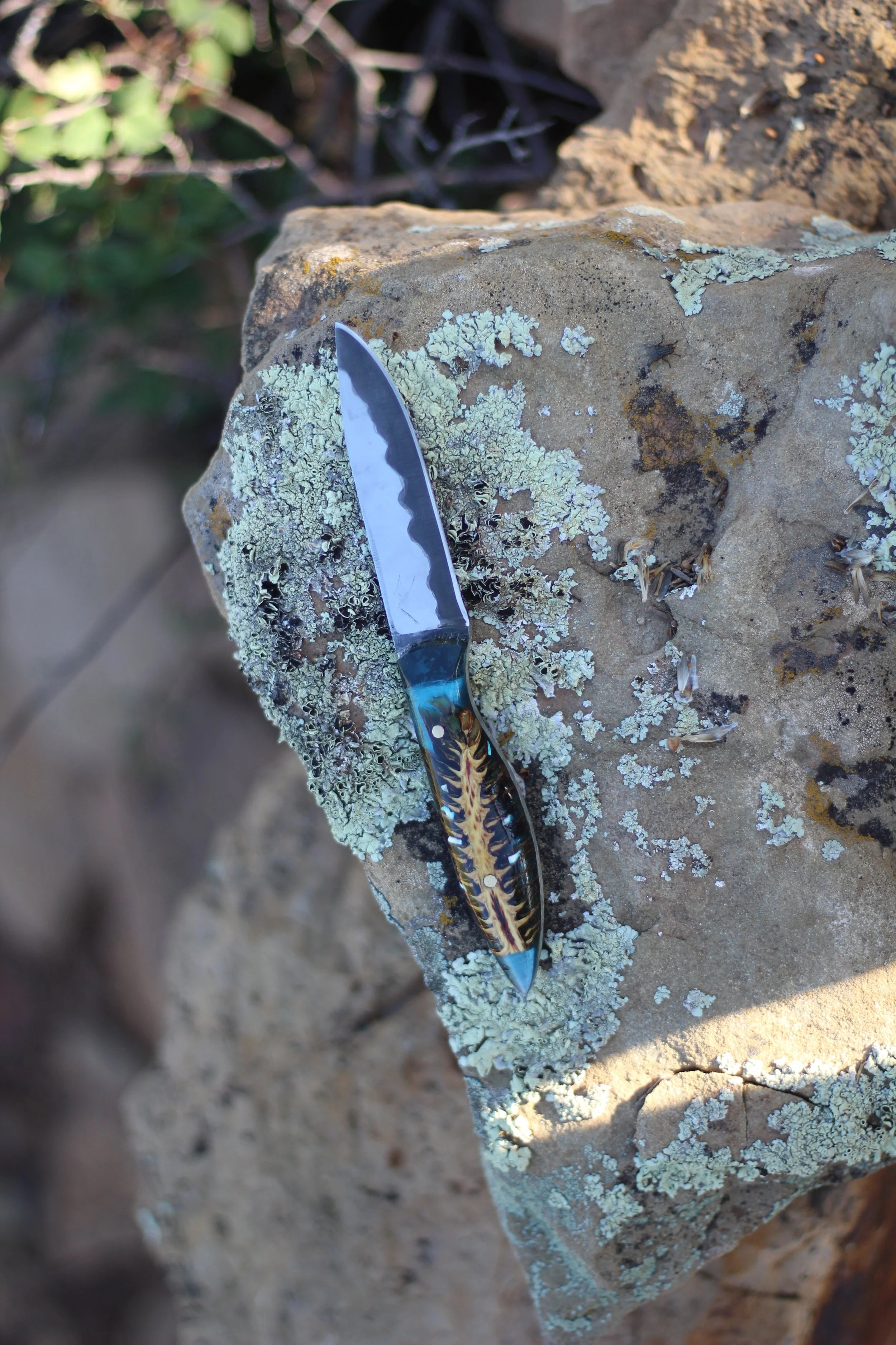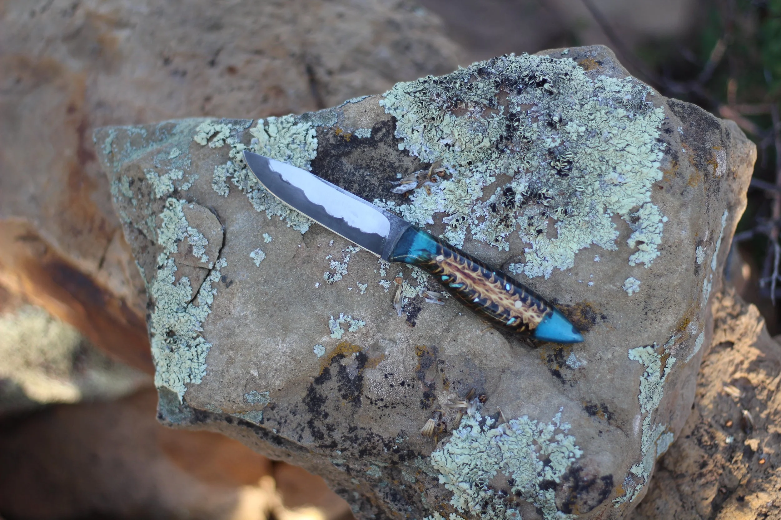 This knife is a great edc. The total length of the knife is 7 inches. The blade is made out of 52100 high carbon steel. The handle is an epoxy resin pinecone.