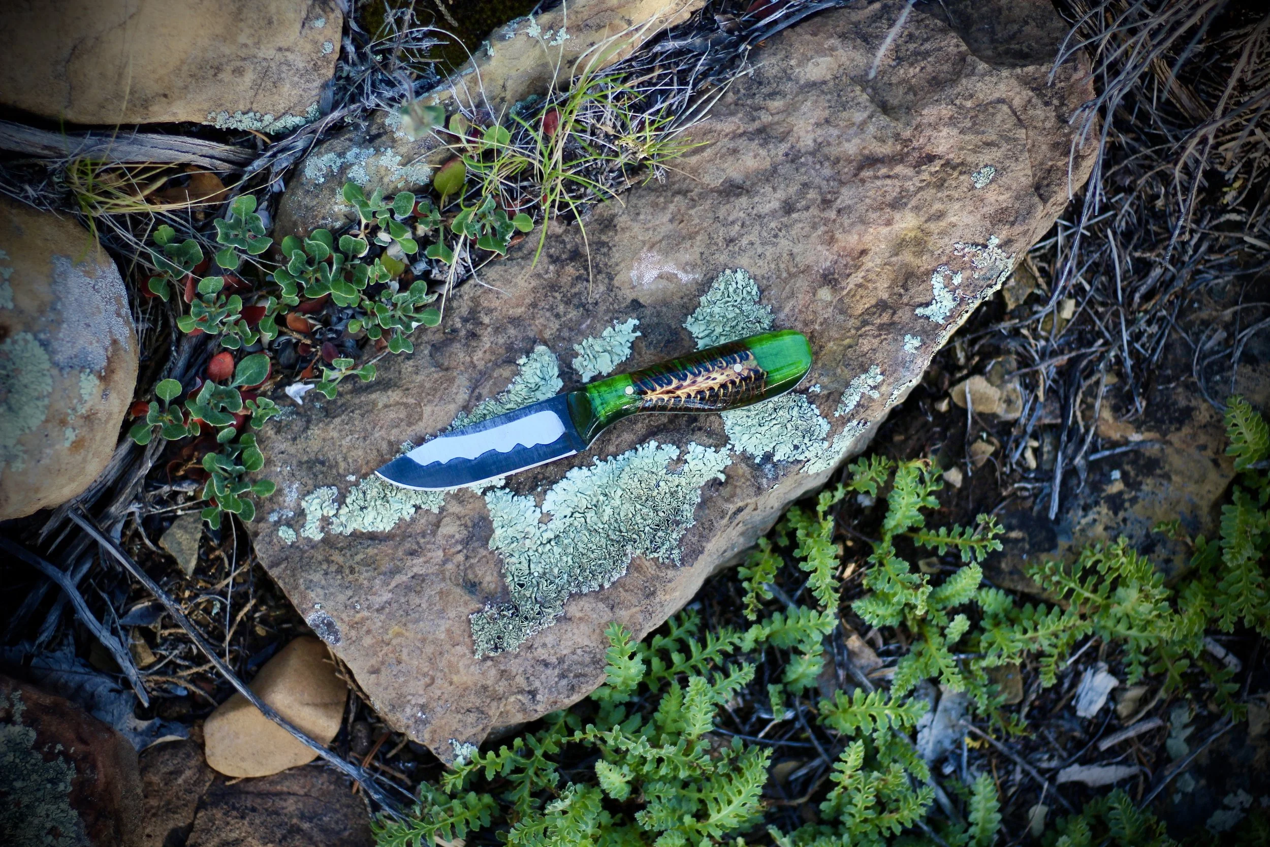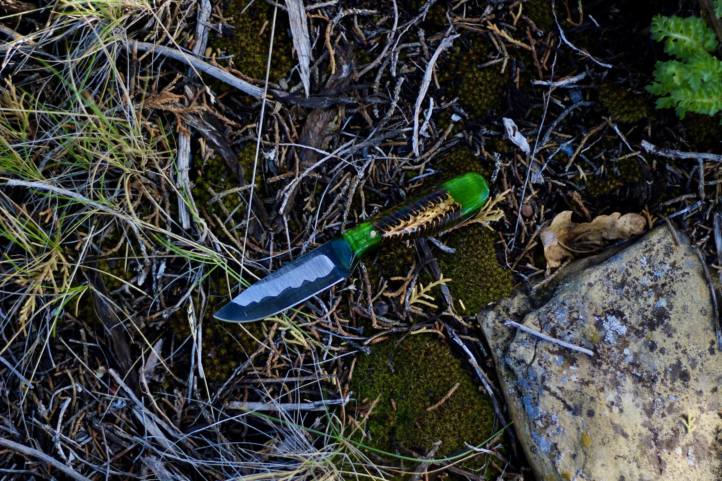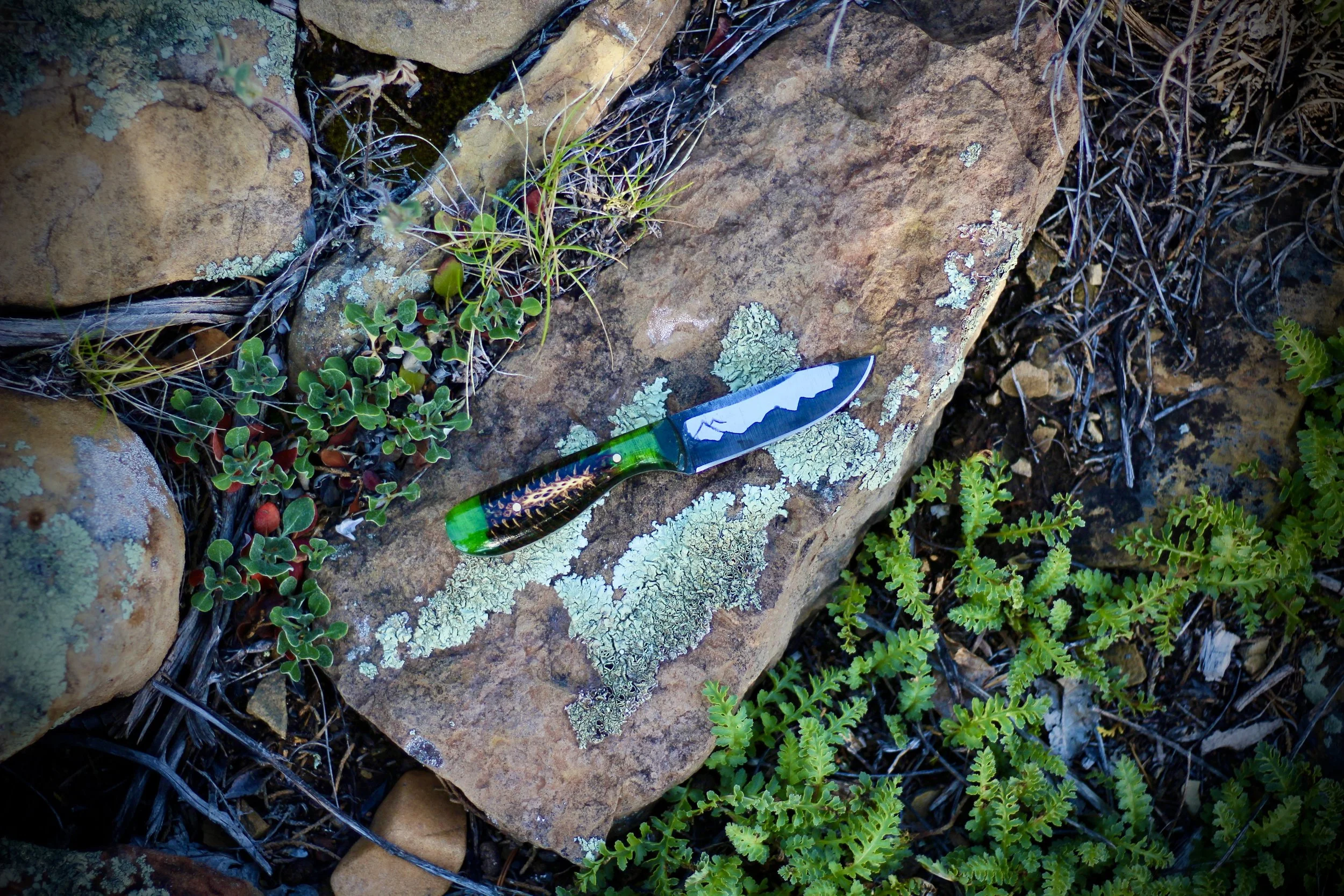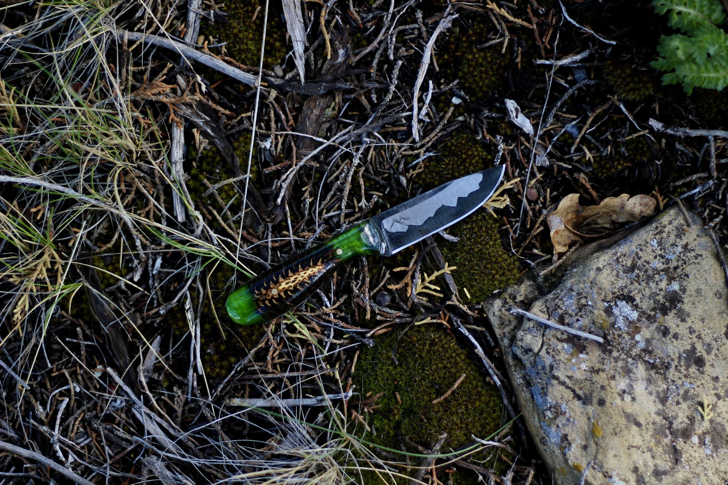 This knife is a great edc. The total length of the knife is 7 inches. The blade is made out of 52100 high carbon steel. The handle is an epoxy resin pinecone.