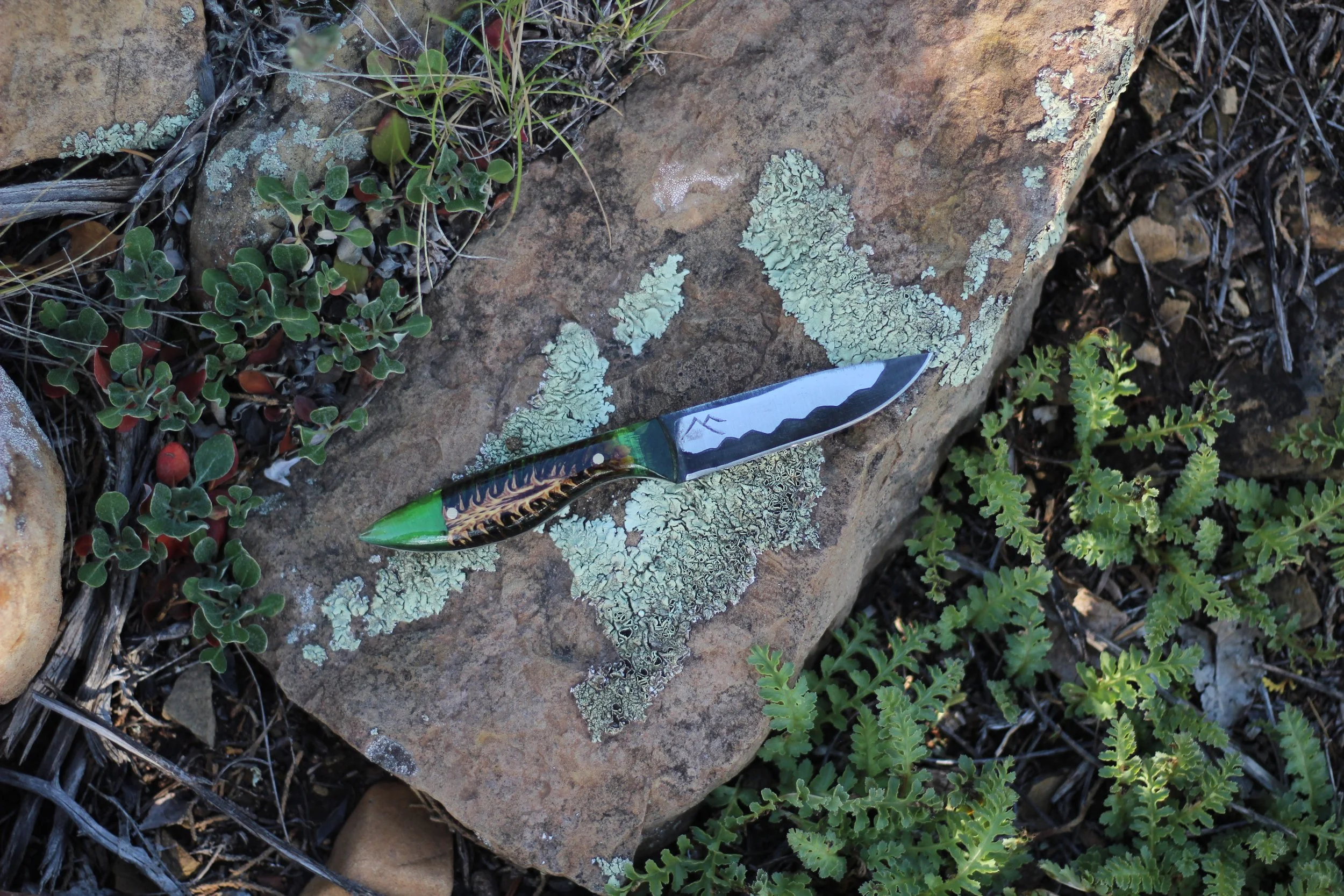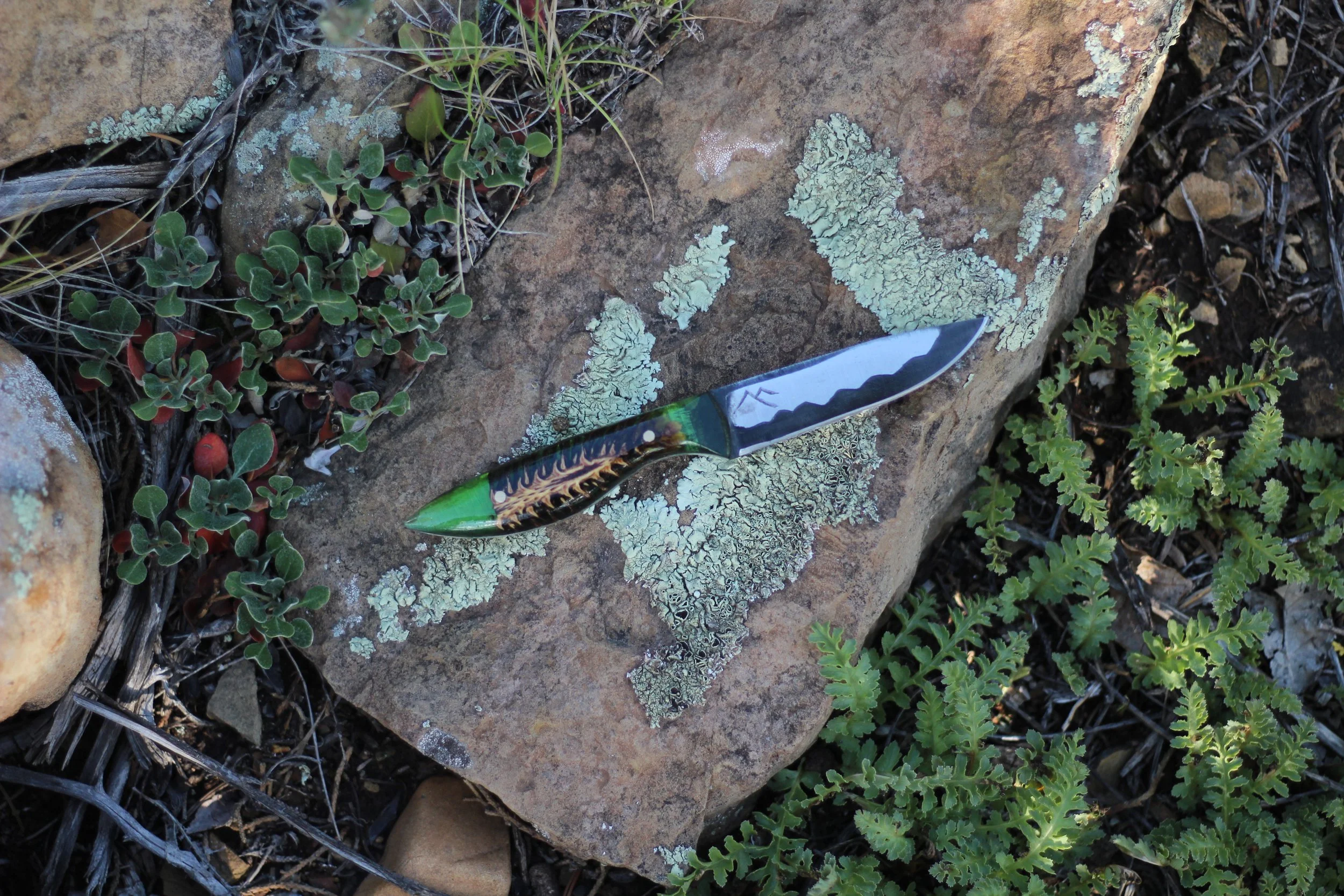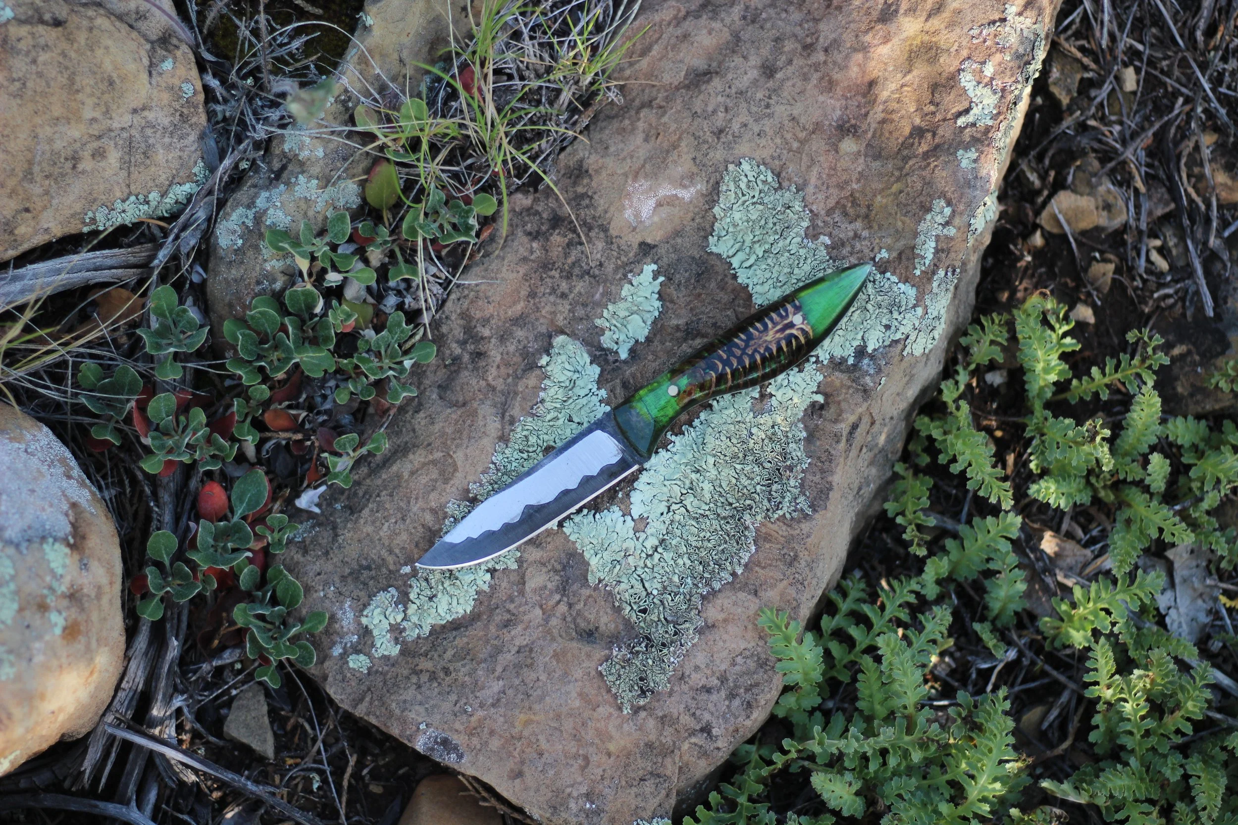 This knife is a great edc. The total length of the knife is 7 inches. The blade is made out of 52100 high carbon steel. The handle is an epoxy resin pinecone.